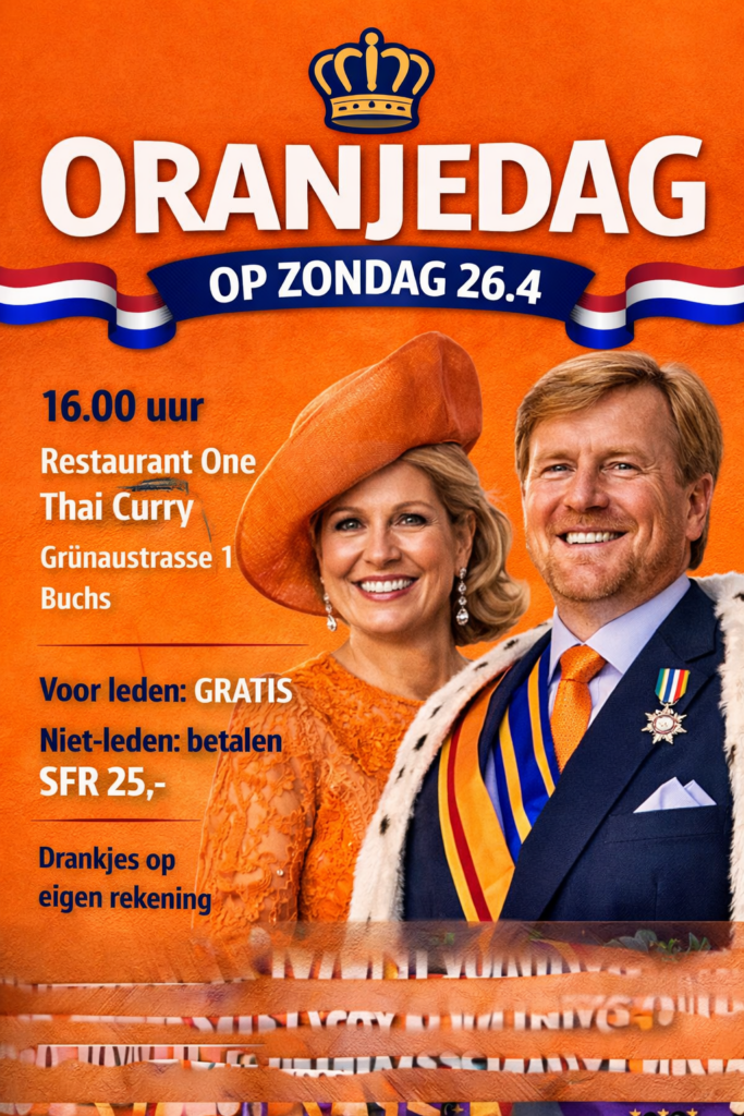 Op zondag 26 april viert de Nederlandse Vereniging Liechtenstein Oranjedag ! Dit jaar doen we dat samen in Restaurant One Thai Curry in Buchs (Grünaustrasse 1).